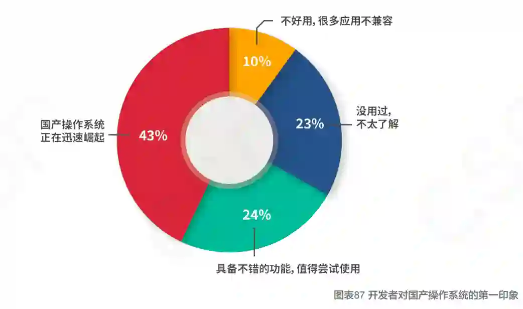 第二点,「国产替代」是一个过程,并不能一蹴而就。实际上,现在已经有不少党政机关、央企国企和个人用户在日常中使用国产操作系统。相比过往,也有越来越多的用户开始关注到国产操作系统的崛起,不久前 CSDN 发布的《2021-2022 中国开发者调查报告》中有 67% 的开发者推荐尝试使用国产操作系统的数据便证实了这一点。