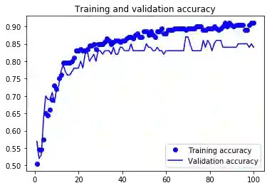 epochs = 100model = models.Sequential()model.add(layers.GlobalAveragePooling2D(input_shape=(7,7,512)))model.add(layers.Dense(1, activation='sigmoid'))model.summary()# Compile modelmodel.compile(optimizer=optimizers.Adam(),loss='binary_crossentropy',metrics=['acc'])# Train modelhistory = model.fit(train_features, train_labels,epochs=epochs,batch_size=batch_size, validation_data=(validation_features, validation_labels))