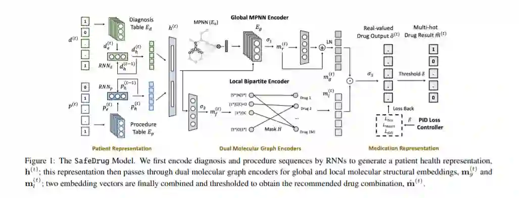 药物推荐是人工智能在医疗保健方面的一项基本任务。现有的工作集中于仅根据电子健康记录为复杂健康状况的患者推荐药物组合。因此,它们有以下局限性:(1)一些重要的数据,如药物分子结构,在推荐过程中没有得到利用。(2)药物-药物相互作用(DDI)模型是隐式的,可能导致次优结果。为了解决这些限制,我们提出了一个DDI可控的药物推荐模型,名为SafeDrug,以充分利用药物的分子结构和DDIs模型。SafeDrug包含一个全局消息传递神经网络(MPNN)模块和一个局部双部学习模块来完全编码药物分子的连通性和功能。SafeDrug还具有可控损失功能,可有效控制推荐联合用药中的DDI水平。在一个基准数据集上,我们的SafeDrug相对显示降低了19.43%的DDI,推荐和实际处方药物组合的Jaccard相似性比以前的方法提高了2.88%。此外,SafeDrug需要的参数也比以前的基于深度学习的方法少得多,从而使训练速度提高约14%,推理速度提高约2倍。