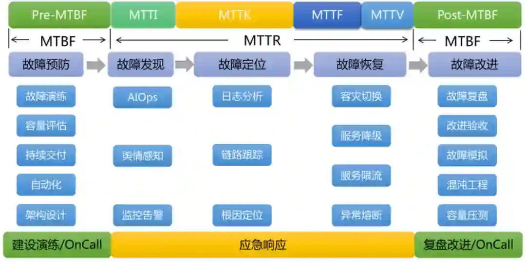 上图是讯飞云内部结合经验沉淀的 SRE 流程。它分为 MTBF(故障平均间隔时间)和 MTTR(故障平均修复时间)两个部分。MTTR 又分为故障发现、定位、处理和恢复的流程。本次分享中主要针对容量评估、架构设计、监控告警和服务限流其中几个模块,讲解 SRE 的保障理念。