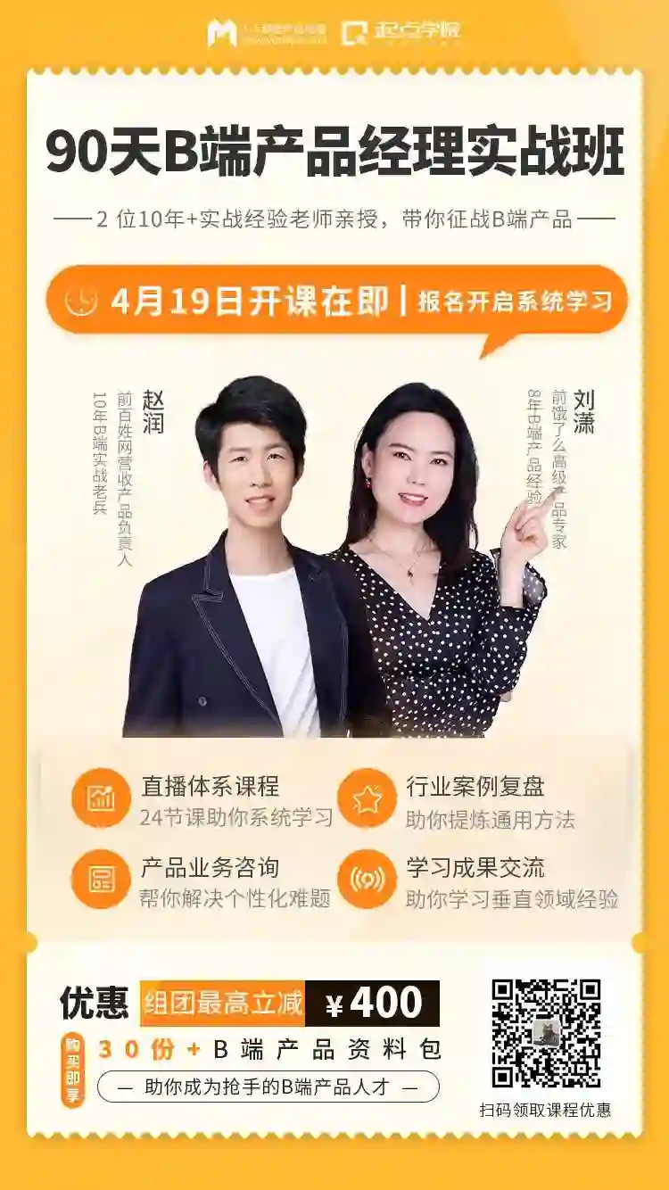 这里向你推荐起点学院新推出的B端产品体系课——《90天B端产品经理实战班》。课程由2 位拥有 10 年 + B 端实战经验的老师亲授,将会围绕“业务分析梳理-产品框架规划-需求洞察-产品设计”这4个B端产品设计中的重难点展开,同时包含开发与实施、迭代与运营的工作全流程。帮助你掌握核心 B 端产品经理的核心工作技能,B端业务的底层逻辑与方法论,顺利转型B端产品经理。