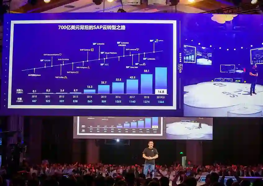 以SAP为例,在过去的10年中,SAP一共花费了近700亿美元收购了Hybris、Success Factors、Ariba、Concur、Fieldglass、Qualtrics,重构了传统核心ERP产品超过4亿条代码以使其符合云计算的架构,并同时发布了S/4HANA Cloud,推出了基于HANA的CRM的解决方案,以及面向工业互联网的Leonardo的解决方案。
