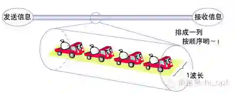 下面通过汽车和车道来说明通信方式。假设汽车代表占有车道的时间(1区间)、货物代表每次搬运的信息量(比特数)、车道代表光的一个波长。