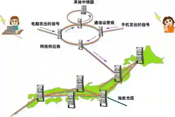 互联网、手机、IP电话等使用网络的设备,将每个人与其所在地区、与整个国家联系起来,甚至连接至全球通信网。比如说,电脑和手机发出的信号聚集在本地通信运营商的基站和网络供应商,再通过海底光缆中的光纤传输至世界各地。
