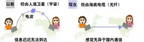 比如说,现在和国外的朋友通话或上网聊天时,感觉与在国内通话没什么两样。不像以前那样声音会滞后。在只有电通信的时代,一次能传输的距离短而且传输的信息量少,国际间的通信主要通过人造卫星作为中继传输。但是,使用光通信的话,一次性传输的距离长而且传输的信息量多,因此,通过使用铺设在海底的光纤光缆,就能实现与海外自然畅通的通信。(电波和光的速度相同。但是,由于经由卫星的话传输路径会变长,信号到达较慢。海底电缆的距离短很多,所以信号会更快达到。)
