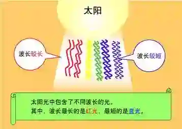太阳光看上去泛白,实际上因为混杂着从红光到蓝光的各色光。也就是说,太阳光中的光的波长各不相同。