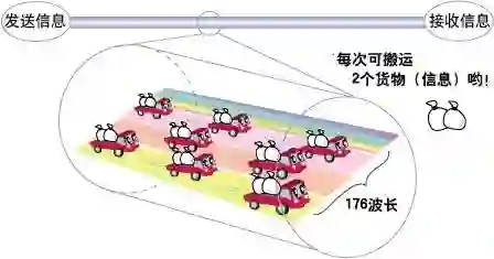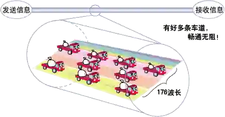 一次能传输的信息量较多,通过改变波长,可同时传输多位用户的信息。比如说,即使多位用户同时发送信息,只要分布着多条车道就不易造成堵塞,能够流畅地运送货物(比特数),而且传输速度比较平稳。