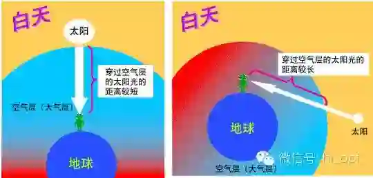 为什么蓝色的天空在傍晚时分会呈现红色呢?这与太阳光穿过空气层的距离有关。太阳下山时,太阳的位置从我们的正上方向水平方向移动。于是,太阳光穿过空气层的距离,比起在正上方时,水平方向时变得更长,之前从灰尘缝隙中穿过的波长较长的红光开始与灰尘发生碰撞。而且,由于蓝光的波长较短,无法到达远处,只有被红光覆盖的天空映入我们的眼帘,因此,夕阳看上去是红色。