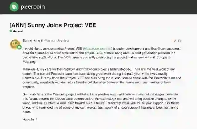Sunny King还说,他仍然在持续关注点点币(Peer Coin)和质数币(Prime Coin),在过去的一年里,点点币团队一直在努力工作。“我希望 VEE 项目也能带来更多资源与点点币团队和社区共享,最终两个项目的团队和社区会保持健康的合作关系。”他写到。