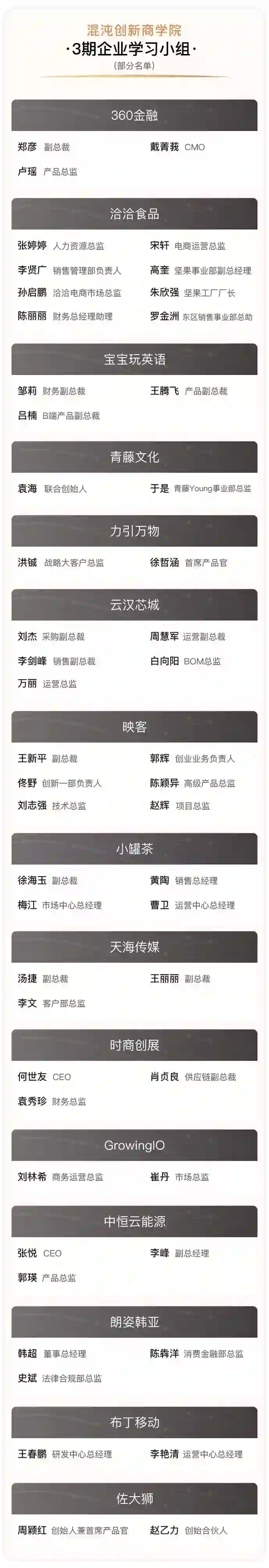 2019年5月6日,混沌创新商学院第三期招生发布以来,我们已收到了近800份商界精英的申请。截至目前,已有来自小罐茶、洽洽食品、分众传媒、创维集团、青藤文化、宝宝玩英语、天海传媒、布丁移动、朗姿韩亚等100+企业学员加入学习。