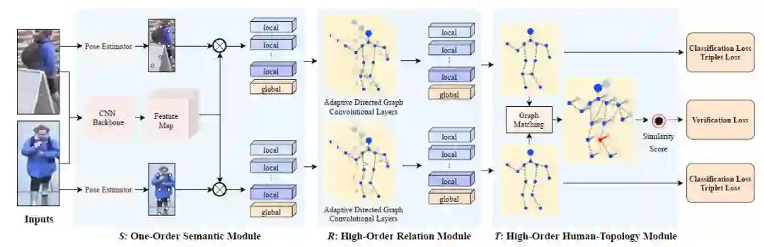旷视研究院提出的框架,包括一个一阶语义模块(S),它可以取人体关键点区域的语义特征;一个高阶关系模块(R),它能对不同语义局部特征之间的关系信息进行建模;一个高阶人类拓扑模块(T),它可以学习到鲁棒的对齐能力,并预测两幅图像之间的相似性。这三个模块以端到端的方式进行联合训练。图2展示了方法的总体框架。