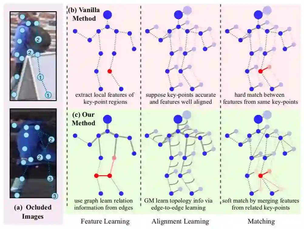 在基于身体部位的特征表示已经被证明对行人重识别是有效的。一种简单的对齐策略是直接去匹配同样关键点之间的特征。然而这种一阶对齐策略并不能应对异常值,特别是当画面人物有大面积遮挡的情况。