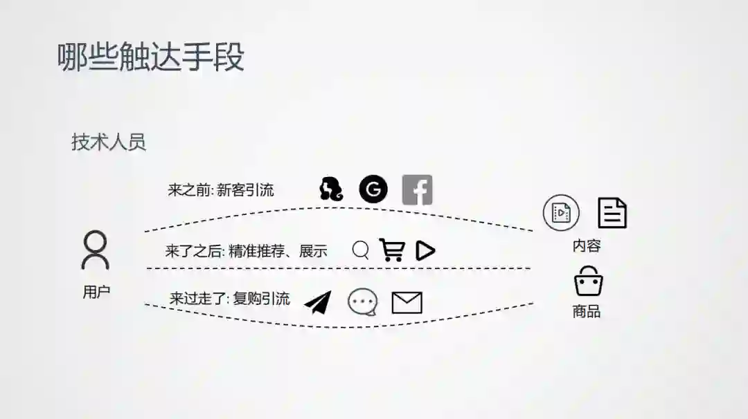 在用户来之前可以进行渠道优选与新客引流,用户来了之后可以对用户进行精准推荐、展示,用户来过走了之后可以对用户进行复购引流,在每个阶段,画像都可以发挥重要作用。