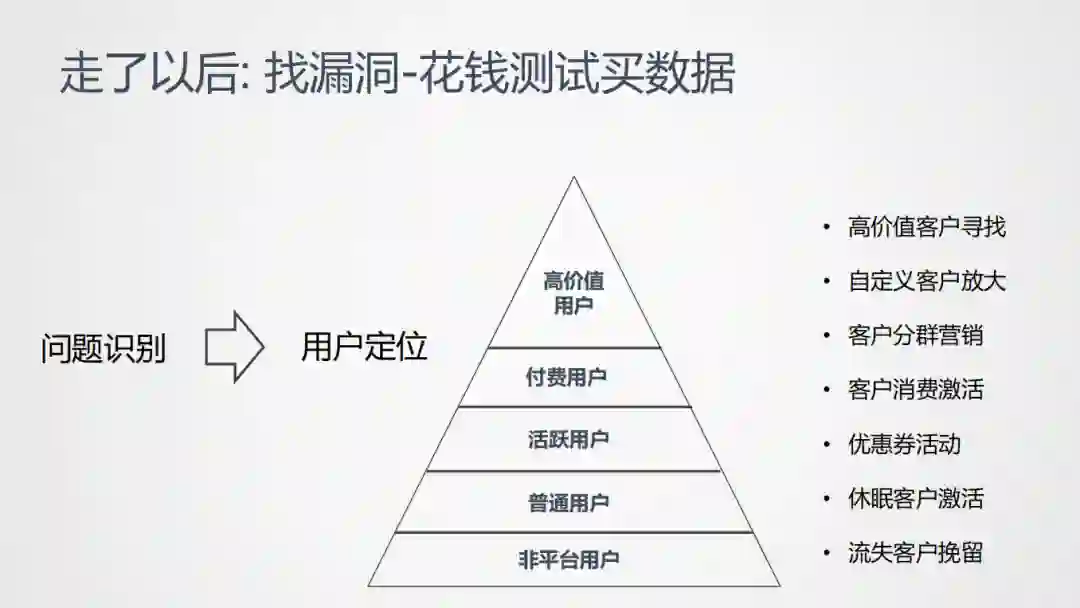 逆向观察RARRA模型,从用户"走了以后"出发,对全链路业务进行复盘,分析目前的产品是否存在问题,并对问题进行定位和优化。根据问题在细粒度的划分之后,再针对不同用户开展不同工作,如高价值客户寻找、自定义客户放大 ( 用户look-like相关的工作 )、针对不同客户群体采取不同营销和消费激活策略、根据客户群体分发优惠券、激活休眠客户和挽留流失客户。对于已经走了的用户,一部分还会回来,还有一部分不会回来,对于这一部分不会回来的用户,可以充分使用他们所留下的数据,帮助我们未来的业务发展给予指导作用;比如后续的召回操作无法挽回的用户,对其在站内的行为与被召回或未流失用户进行比对,可能可以洞察他们消费的内容是否符合其需求 ( 可以与搜索行为结合一起来看 ) 等。