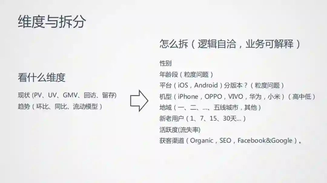 刚刚说到,要对用户群进行拆分,可以从多种不同维度出发,例如对现状的统计,有PV、UV、GMV、回访、留存等,对趋势的统计如环比、同比、流动趋势等。具体的如何对用户进行拆分,要从业务出发,做到逻辑自洽,业务可解释,比如根据性别、年龄段、设备平台对用户进行拆分,这就涉及了粒度问题,比如年龄段是将15~25岁还是将15~30岁划分为一个区间,安卓或iOS版本号如何划分区间。