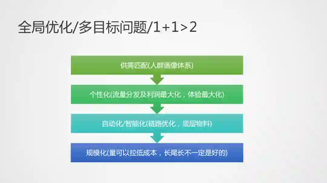 从全局优化来讲,构建人群画像体系可以获知群体的需求,进而优化供需之间的匹配;进一步可以在个性化层面进行优化,实现流量分发以及利润最大化,更优的个性化也会带来用户体验的最大化;用户画像可以自动化/智能化的实现物料投放和供需匹配结果;结合用户画像可以优先去拓展与大盘群体相似的群体,能更好的实现规模化,这里补充一点:电商场景下用户具有长尾效应,但是平台更希望流量具有一定的集中度,以便更好的优化成本。