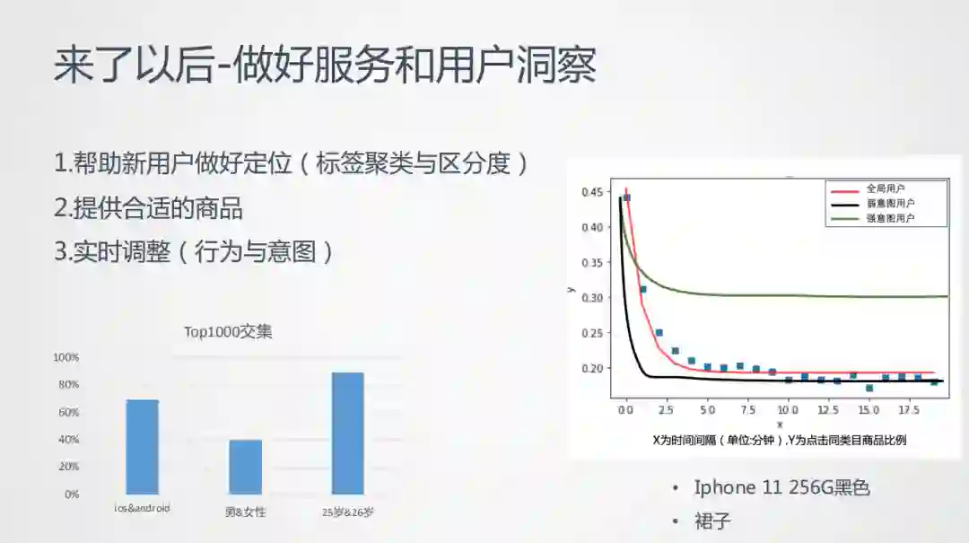 新用户来了之后,需要做好服务和用户洞察。新用户面临着推荐中的冷启动问题,首先要帮助新用户做好定位,选择有区分度的标签对新用户进行划分,区分度可以用不同群体偏好的交集来衡量,如男性女性最喜欢的1000个商品的交集,然后根据划分的用户群给新用户推荐该用户群体最喜欢的商品,再根据用户实时行为获知用户的意图,对推荐结果进行调整。用户进入平台后,有过搜索行为的用户可以分为两类,一类是强意图用户 ( 用户搜索词是某一个品牌具体的型号,具有明确的属性信息,如iPhone 11 256G黑色 ),一类是弱意图用户 ( 搜索词比较简单,如裙子 ),强意图用户进入站内后同类目商品的点击比例衰减明显慢于弱意图用户,弱意图用户则接近大盘用户。根据这一标签可以去干预用户推荐结果,更好的做好用户服务,使用户体验更好。