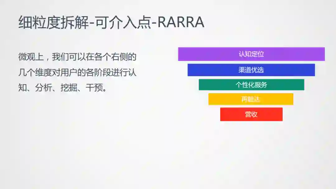 微观上,根据RARRA模型,落地到用户侧,则可以从认知定位、渠道优选、个性化服务、再触达和营收这五个维度内对用户的各个阶段进行认知、分析、挖掘和干预。下面将围绕上述几点进行案例展开。
