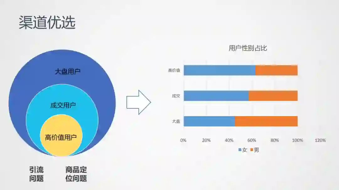 在渠道优选中画像可以用于解决引流问题和商品定位问题。进入站内的用户都可以称为大盘用户,其中有购买行为的用户称之为成交用户,成交量达到一定量级、留存高的用户称之为高价值用户。以性别来对3类用户进行划分,可以发现从下到上三类用户中女性占比越来越高,对于平台收益而言最重要的是高价值用户,那么在用户引流过程中我们期望结合用户划分分析结果能引流到更多的高价值用户,如果当前的高价值用户中女性占比更高,那么在引流时,优先考虑女性用户更多的渠道进行投放。同时可以进一步分析商品定位是否有问题,如男性用户比例降低是否是由于男性用户被男性商品吸引进入平台,但在平台内男性商品占比很少或者是价格段不理想,结合画像标签可以对站内商品定位问题进行进一步的分析。