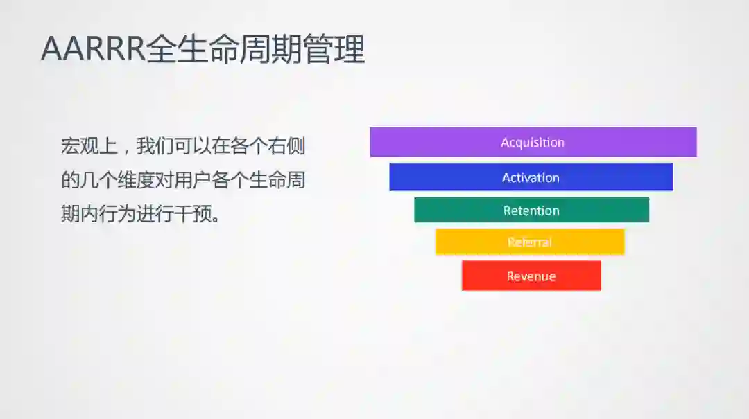 宏观上,AARRR模型,也称海盗模型,是业内常用的模型,能够有效推动业务发展与迭代,可以对用户各个生命周期内的行为进行干预。