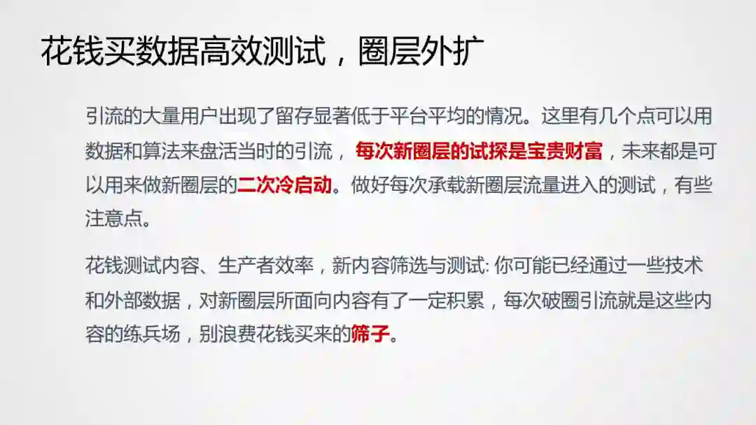 引流的用户中总是存在低留存的用户,原因可能有多种:供给侧没有满足用户需求的商品,推荐没有展现给用户他所需要的商品,没有做好内容区隔等。使用这部分用户在站内的行为数据,如搜索数据,比如对二次元商品感兴趣的用户中同时具有搜索行为的用户比不具有搜索行为的用户的留存率是否更高,根据具体的点来对推荐进行迭代。根据分析得到的结果,可以对这些低留存用户进行二次冷启动。
