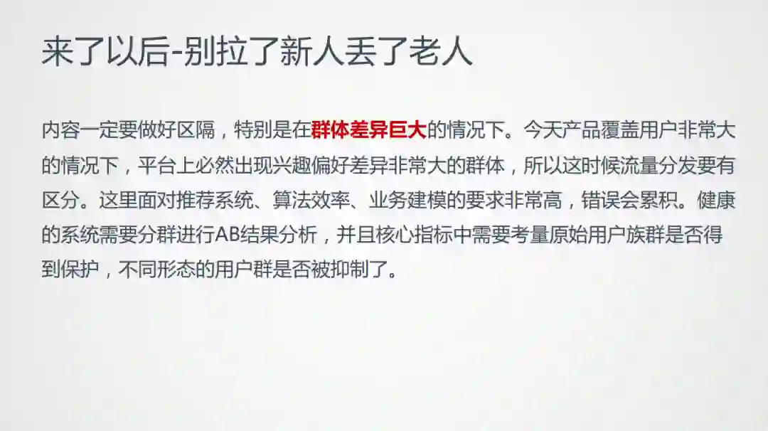 做好新用户服务的同时,要保证老用户的体验不会变差。在内容平台的推荐场景下中,这类问题变得尤为明显。在产品覆盖用户非常大的情况下,平台必然会出现兴趣偏好差异非常大的群体,针对不同群体,要考量其不同需求,在内容上做好区隔。