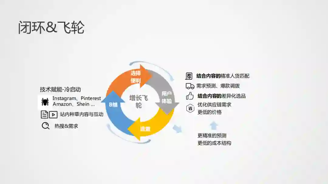 使用闭环和飞轮的思想更好的迭代用户画像和整个系统。首先是以技术赋能解决冷启动,分析其他平台上热销的商品,结合市场运营的指导来做初步的投放,根据初步的投放效果分析用户的偏好用于指导站内的需求预测,使得预测更精准,有了初步的流量之后就可以不断的进行迭代。