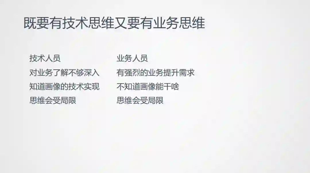 为了促使用户画像在业务中有更大的效能,必须同时具备技术思维和业务思维。目前,在画像的业务应用中面临的问题是:技术人员对业务不够了解,只是单方面的了解画像的技术实现,因此对于画像应用方面会有思维局限;而业务人员有强烈的业务提升需求但是不清楚画像在业务中能发挥何种作用,因此同样思维受限。所以,要充分发挥画像的业务效能就必须打通业务和技术。下面我们分别按阶段展开,进行应用的介绍。