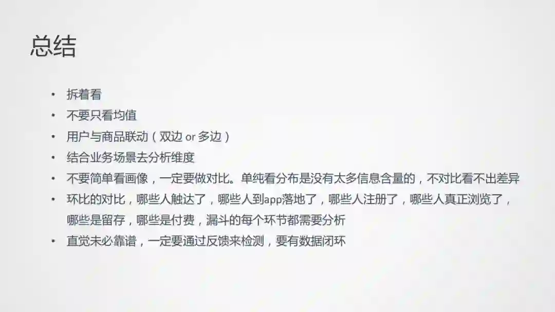用户和商品联动:分析结果要将用户和商品联动,关注供给侧是否满足了用户的需求,推荐展示是否满足了用户的需求,根据用户画像驱动供给侧、前端的优化;