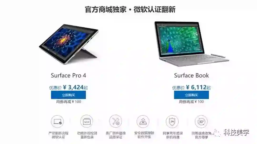领券后,微软官方商城Surface Pro 4官翻机售价3324元起,Surface Book官翻机售价6012元起。