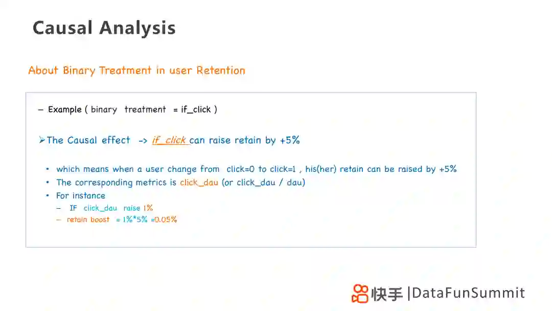 经过PSM之后,我们假设得到结论:点击会让留存率提升5%,意味着一个用户进行点击行为后,其留存可以提升5%,反映到相应的指标便是click_dau(点击日活跃人数)。例如click_dau提升了1%,那么整体留存率应该提升5%×1%=0.05%。