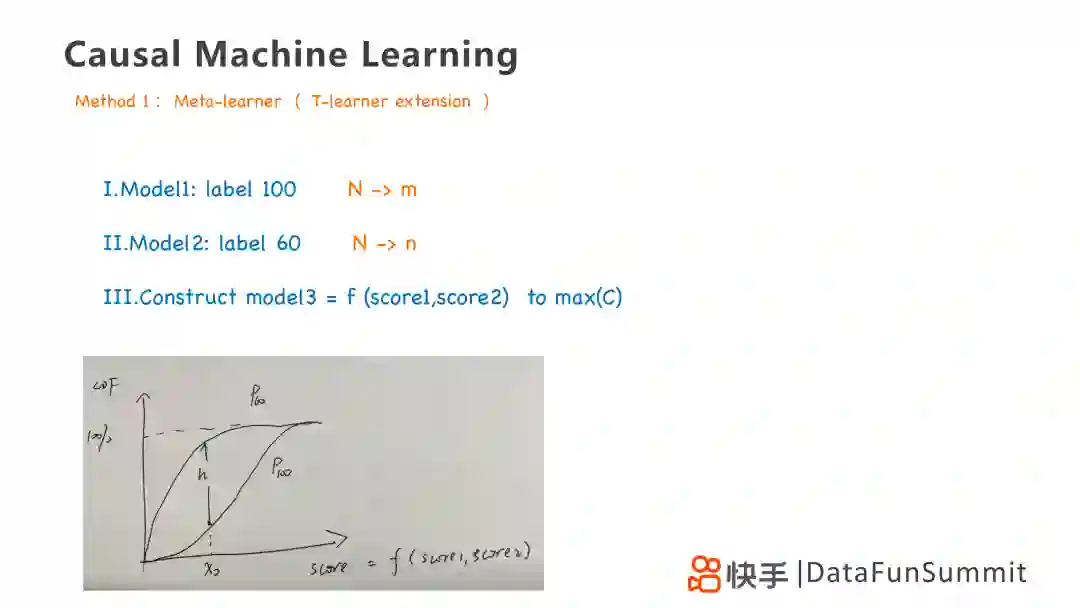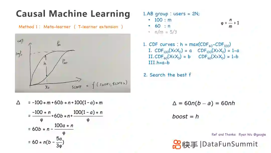 第一个方法是Meta-learner,是T-learner模型的一个拓展,通过训练两个模型,并画出购买用户的累计分布曲线,找到两个策略最大的gap,在图中即为h。我们可以通过累计分布曲线去优化,得到第三个策略,是前两个策略的线性叠加。
