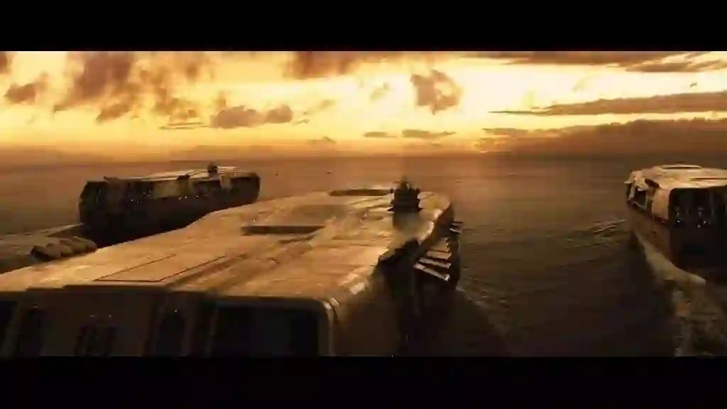 《2012》剧照,人类为延续文明造了几艘方舟巨船,但船票价格高达每人10亿英镑