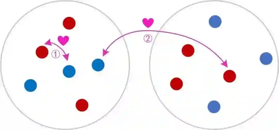图5 不同圈子男女婚恋结合示意图:路径①需要克服的逆熵较低,故而较为容易;路径②需要克服的逆熵较高,故而较为困难;