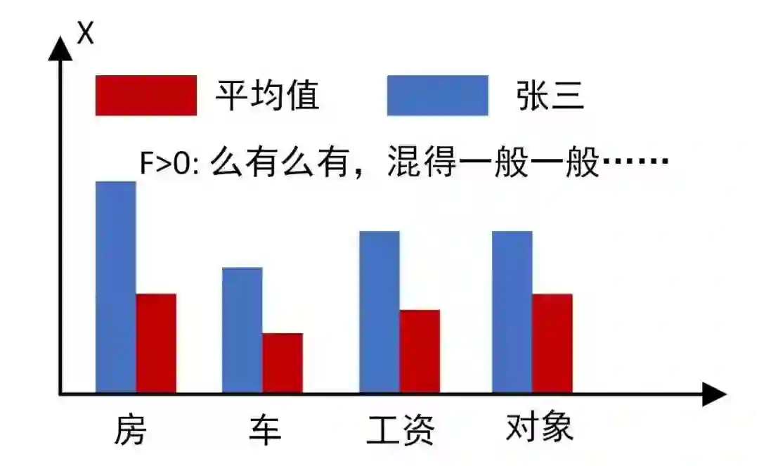 显然,集合X具有显著的物质属性,它并不决定于物质之外的因素,也就是说,一个青年品性如何、才华如何、见识如何、阅历如何,均不会对X产生影响。根据上述定义,对单身狗而言,X对象=0;就对象数目而言,由于有的人有对象,有的人没对象,且鉴于我国实行一夫一妻制的客观事实,X对象的平均值必属于开区间(0,1)。该模型解释如下:根据力学理论,当F<0时,受到的是压力;反之,本文将其定义对外界输出的压力。假设有一理想大龄青年张三(大龄意味着N-Ne>0),不论Xi指向房、车、工资或是对象,若Xi取值都低于周围同龄人平均值Xi*,则F返回值为负,该研究对象就会受到来自外界的巨大压力,如图1所示: