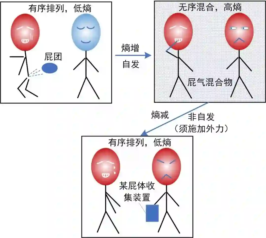 图4 如果将屁和空气视为一个系统,那么该系统只可能自发地由“屁团+空气”的有序状态扩散形成无序的“屁气混合物”;若要逆向实现“屁气分离”这一过程,必须依靠外力,即图中某屁体收集装置。