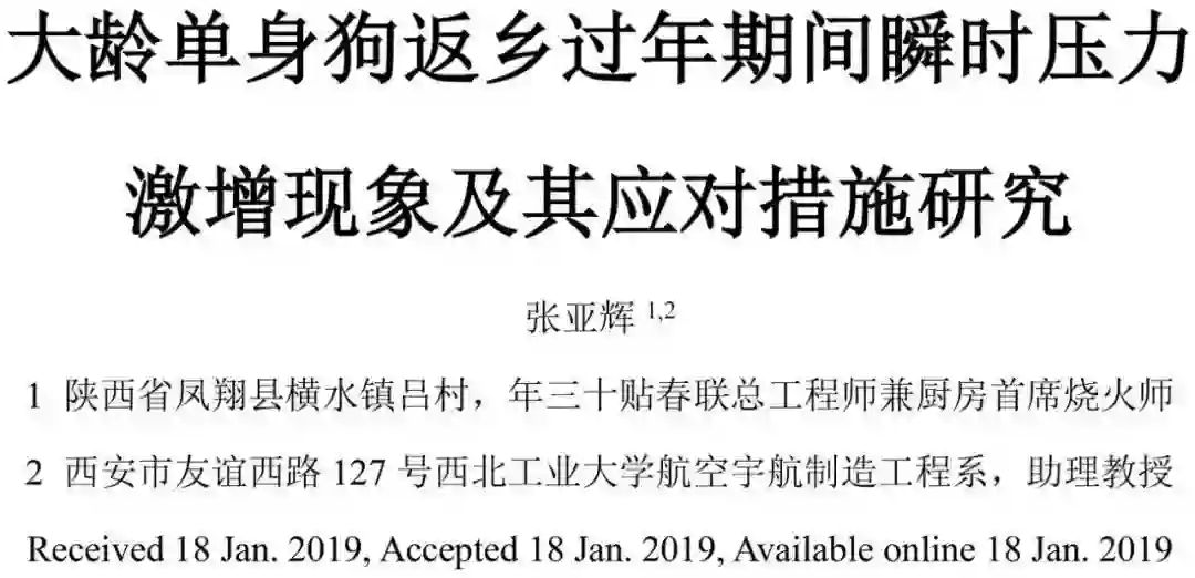 单身狗,虽名为狗,实非犬类,属大型灵长目群居哺乳动物,主要分布在亚欧大陆东侧,长城内外大江南北均可见其踪迹,是中华民族大家庭里不可分割的一员。每年一二月间春节来临之际,单身狗种群常会出现周期性的大规模迁徙返乡现象。在此期间,大龄单身狗常因其“大龄”、“单身”等属性而受到来自家庭和社会的各方压力,常表现在“房买了吗?”“车买了吗?”“赚多少啊?”等大规模杀伤性问题以及“每逢佳节被催婚”这一传统社会现象,更有甚者,个别大龄单身狗会遭到“再找不到对象就别回来过年了”这一直戳心灵的史诗级威胁,其间境遇,目不忍视,耳不忍闻,口不忍述。长期以来,返乡过年期间的瞬时压力激增现象,已经对大龄单身狗的身心健康造成了严重损害。青年强,则国强;国强,则全球治理强;球强,则碳基文明强。因此,对大龄单身狗返乡过年期间瞬时压力激增现象及其应对措施开展深入研究,不仅是拯救广大大龄单身狗的迫切需求,更是实现全球人类和谐发展乃至宇宙碳基文明永葆生机的有力保证。