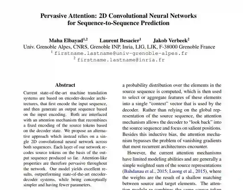 本文提出了一种替代方法,该方法于跨两个序列的单个2D卷积神经网络。网络的每一层都根据当前的输出序列重新编码源令牌。因此,类似注意力的属性在整个网络中普遍存在。我们的模型在实验中表现出色,优于目前最先进的编码器-解码器系统,同时在概念上更简单,参数更少。
