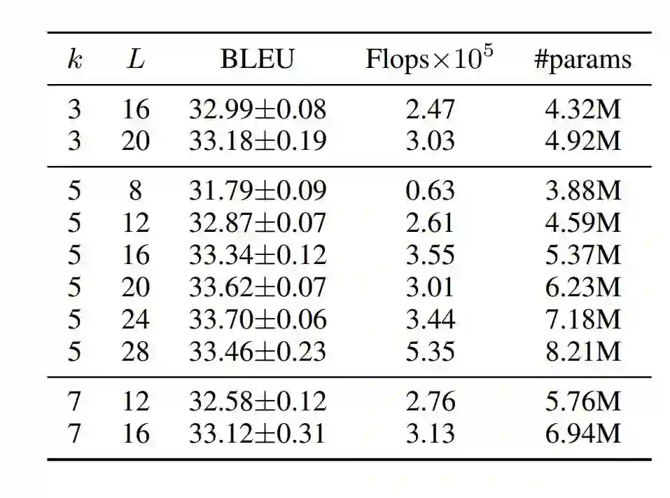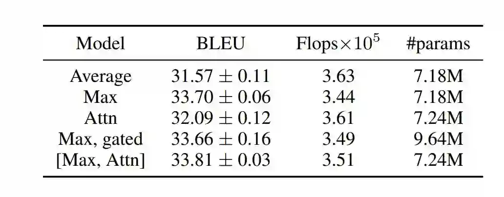 因此,添加明确的“自注意模块”具有非常有限、但十分积极的效果。然而,我们模型中的最大池化运算符生成的隐式句子对齐,在性质上与注意力机制生成的对齐类似。我们在IWSLT'14数据集上评估了我们的模型,将德-英双语互译。
