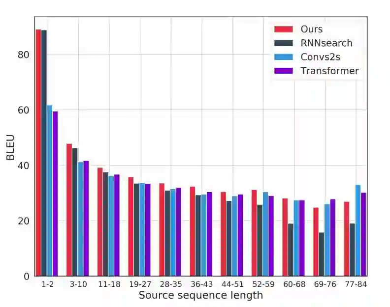 在上图中,我们将翻译质量视为句子长度的函数,并将我们的模型与RNNsearch、ConvS2S和Transformer进行比较。结果表明,我们的模型几乎在所有句子长度上都得到了最好的结果,ConvS2S和Transformer只在最长的句子上表现更好。总的来说,我们的模型兼备RNNsearch在短句中的强大表现,同时也接近ConvS2S和Transformer在较长句子上的良好表现。