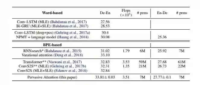 我们将结果与表3中的现有技术进行了比较,包括德-英翻译(De-En)和英-德翻译(En-De)。我们的模型名为Pervasive Attention。除非另有说明,我们使用最大似然估计(MLE)训练所有模型的参数。对于一些模型,我们会另外报告通过序列水平估计(SLE,如强化学习方法)获得的结果,我们通常直接针对优化BLEU量度,而不是正确翻译的概率。
