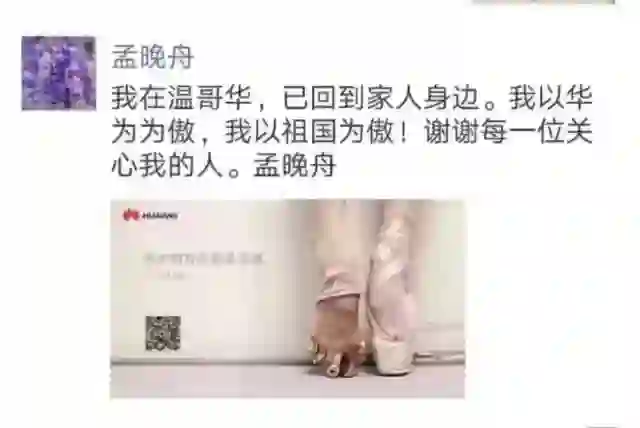 2018年12月11日,加拿大法院作出裁决,批准了孟晚舟的保释申请,走出法庭后,孟晚舟发了个朋友圈,称“我以华为为傲,我以祖国为傲!配图是一张‘芭蕾脚’的华为广告图,上面写着:伟大的背后都是苦难。”