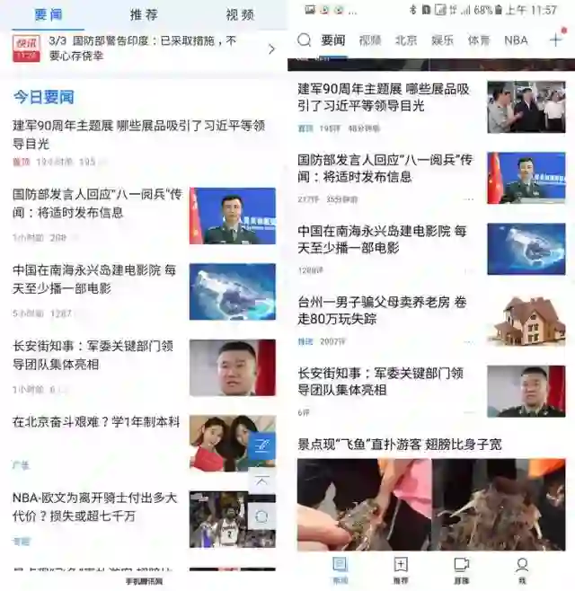 Galaxy S8在导航栏隐藏状态下的夸克“腾讯网”轻应用与腾讯新闻客户端对比,左侧承载的信息量更大且并没有因为导航键隐藏而影响操作