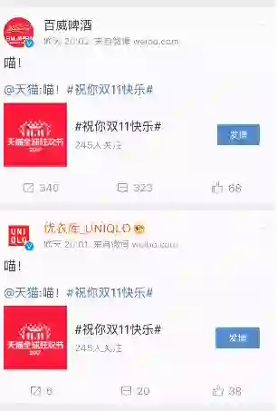 这52张海报的发布形式也非常有趣,天猫在微博上率先发了一句“喵!#祝你双11快乐#”后,百威、优衣库、肯德基等合作品牌纷纷跟进,一同在微博上转发喊“喵!”随后各自发布了自己的专属海报。