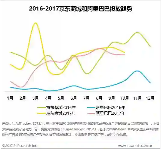 结合近两年的数据来看,相较于2016年,今年京东商城和阿里巴巴在投放规模上都有了很大程度的提升。京东商城全年的起伏较大,针对家装节、618、双十一等大促活动,3月、6月、9月都有明显的投放巅峰期,天猫则是从年初开始就一直呈现上升趋势,到8月呈现投放峰值,其中,天猫超市获得了非常大的关注。