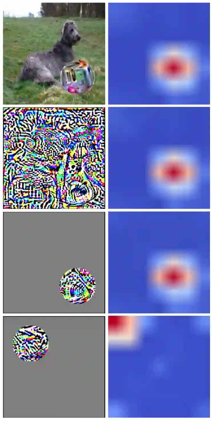 图 13 左上为一张狗的图像,上面覆盖着一个对抗性补丁。右侧为对目标类别 "toast" 的 Grad-CAM 热图。我们从随机噪声开始,其中没有任何 "toast" 类别的突出区域,对损失函数进行优化输入。图 13 证明了在收敛时生成的噪声的热图输出与原始热图在视觉上是一致的。这表明,Grad-CAM 的输出是可以通过梯度优化来精确操纵的。然而,为了发动这样的有效攻击,攻击者需要在整个图像上添加噪声,这在实际上是不可行的。