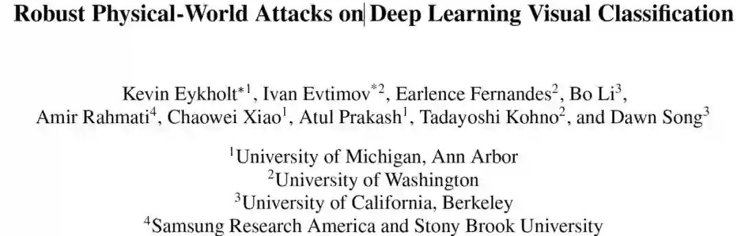 [1] Kevin Eykholt; Ivan Evtimov; Earlence Fernandes; Bo Li; Amir Rahmati; Chaowei Xiao; Atul Prakash; Tadayoshi Kohno; Dawn Son,Robust Physical-World Attacks on Deep Learning Visual Classification,CVPR 2018, https://ieeexplore.ieee.org/document/8578273(https://robohub.org/physical-adversarial-examples-against-deep-neural-networks/)