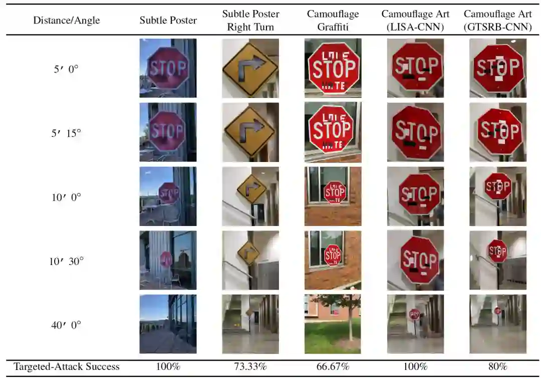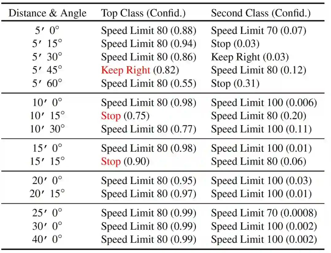 作者表示,据他所知,目前还没有评估物理对抗性扰动的标准化方法。在本实验中,作者主要考虑角度和距离因素,因为它们是本文所选的用例中变化最快的元素。靠近标志的车辆上的相机以固定的时间间隔拍摄一系列图像。这些图像的拍摄角度和距离不同,因此可以改变任何特定图像中的细节数量。任何成功的物理扰动必须能够在一定的距离和角度范围内引起有针对性的错误分类,因为车辆在发出控制器动作之前,可能会对视频中的一组帧(图像)进行投票确定。在该实验中没有明确控制环境光线,从实验数据可以看出,照明从室内照明到室外照明都有变化。本文实验设计借鉴物理科学的标准做法,将上述物理因素囊括在一个由受控的实验室测试和现场测试组成的两阶段评估中。
