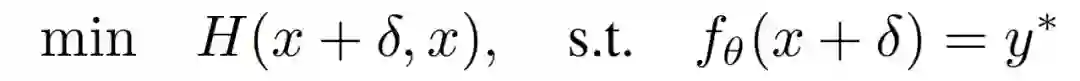 其中,J(·,·)为损失函数,其作用是衡量模型的预测和目标类别标签 y * 之间的差异。λ为超参数,用于控制失真的正则化水平。作者将距离函数 H 表征为 ||δ||_p,即δ的 Lp 范数。