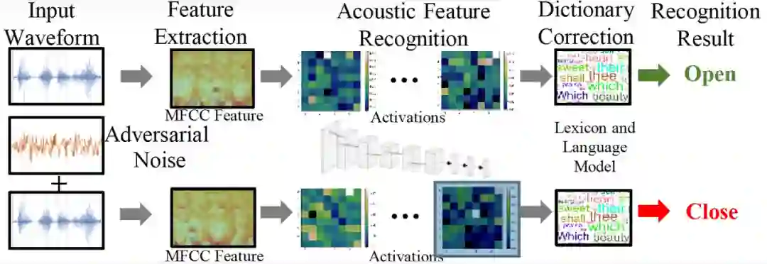 图 2 给出一个典型的音频识别过程和相应的物理对抗性攻击。首先,提取音频波形的梅尔倒谱系数 MeI-Freguency CeptraI Coefficients (MFCC) 特征。然后利用 CNN 来实现声学特征识别,从而获得候选音素。最后,应用词库和语言模型得到识别结果 "open"。将对抗性噪声注入到原始输入波形中时,最终的识别结果会被误导为 "close"。